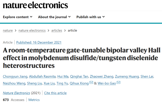 近日,我校金年会jinnianhuicom青年教师马惠在《自然·电子学》(《Nature Electronics》)上发表了题为《A room-temperature gate-tunable bipolar valley Hall effect in molybdenum disulfide/tungsten diselenide heterostructures》的研究成果。马惠为该论文的共同第一作者,新加坡南洋理工大学高炜博教授和清华大学物理系熊启华教授为通讯作者。该项成果为马惠2018年在新加坡南洋理工大学做访问学者期间与合作者共同开展,并于访学回国后持续合作完成的。《Nature Electronics》是有重要影响的国际学术期刊,影响因子长期保持在30以上。